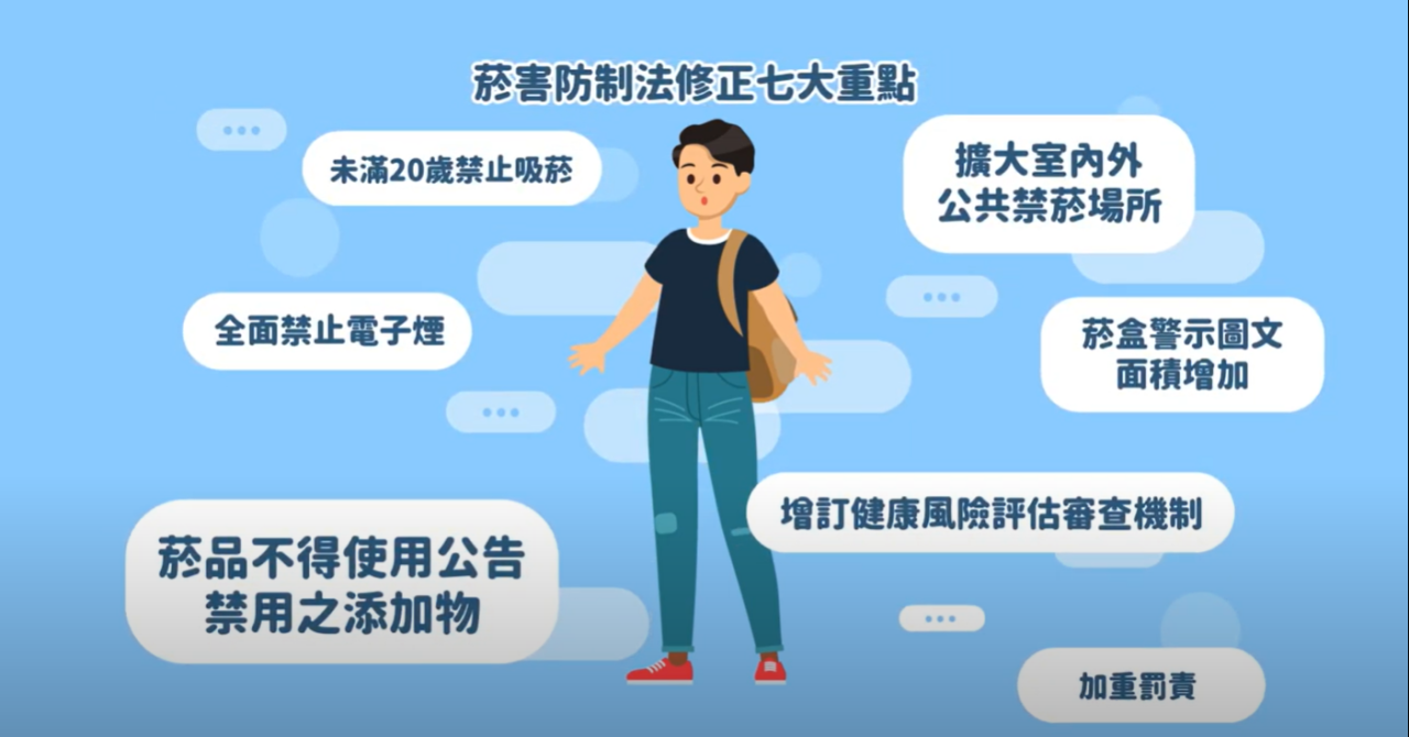 修正之菸害防制法自 112 年 3 月 22 日施行,有關青少年菸害防制相關法規內容修改說明如下: