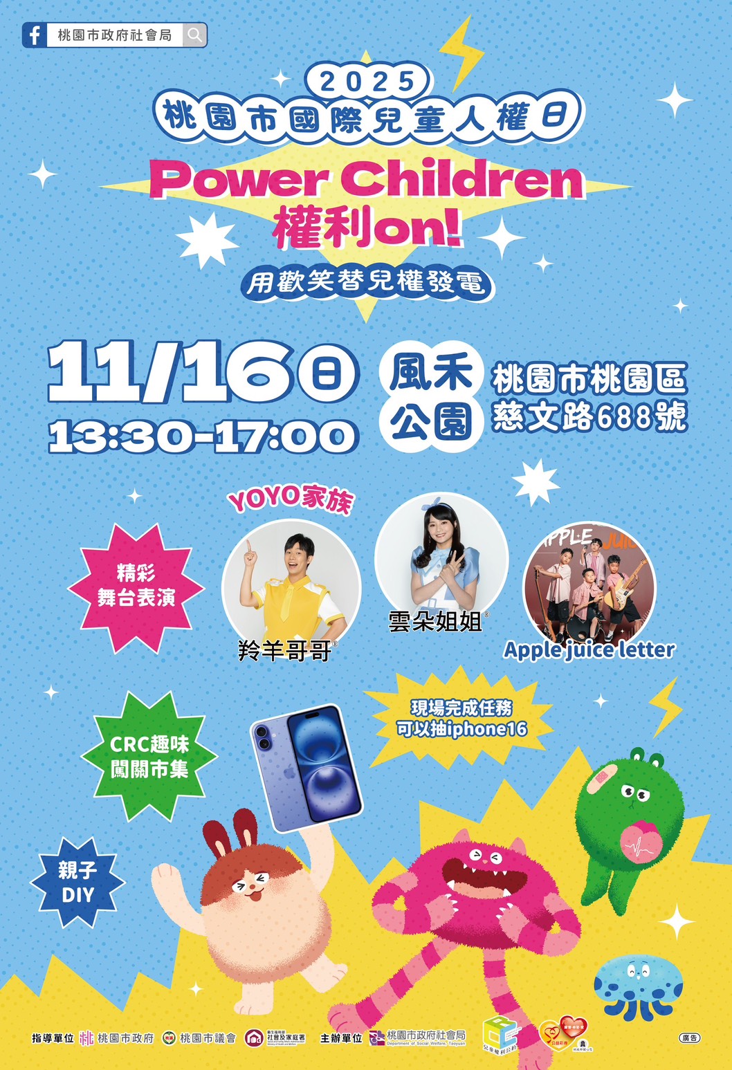 | 三、 | 本次活動以「用歡笑替兒權發電」為主軸,現場規劃「CRC 闖關區」、「Q 萌放電休閒區」、「兒權知能充電區」與「Q 萌手作區」等主題攤位,結合 CRC 概念的設計互動闖關並邀請多組卡司登場與親子互動,亦有豐富精美多項好禮,歡迎踴躍參與。 |