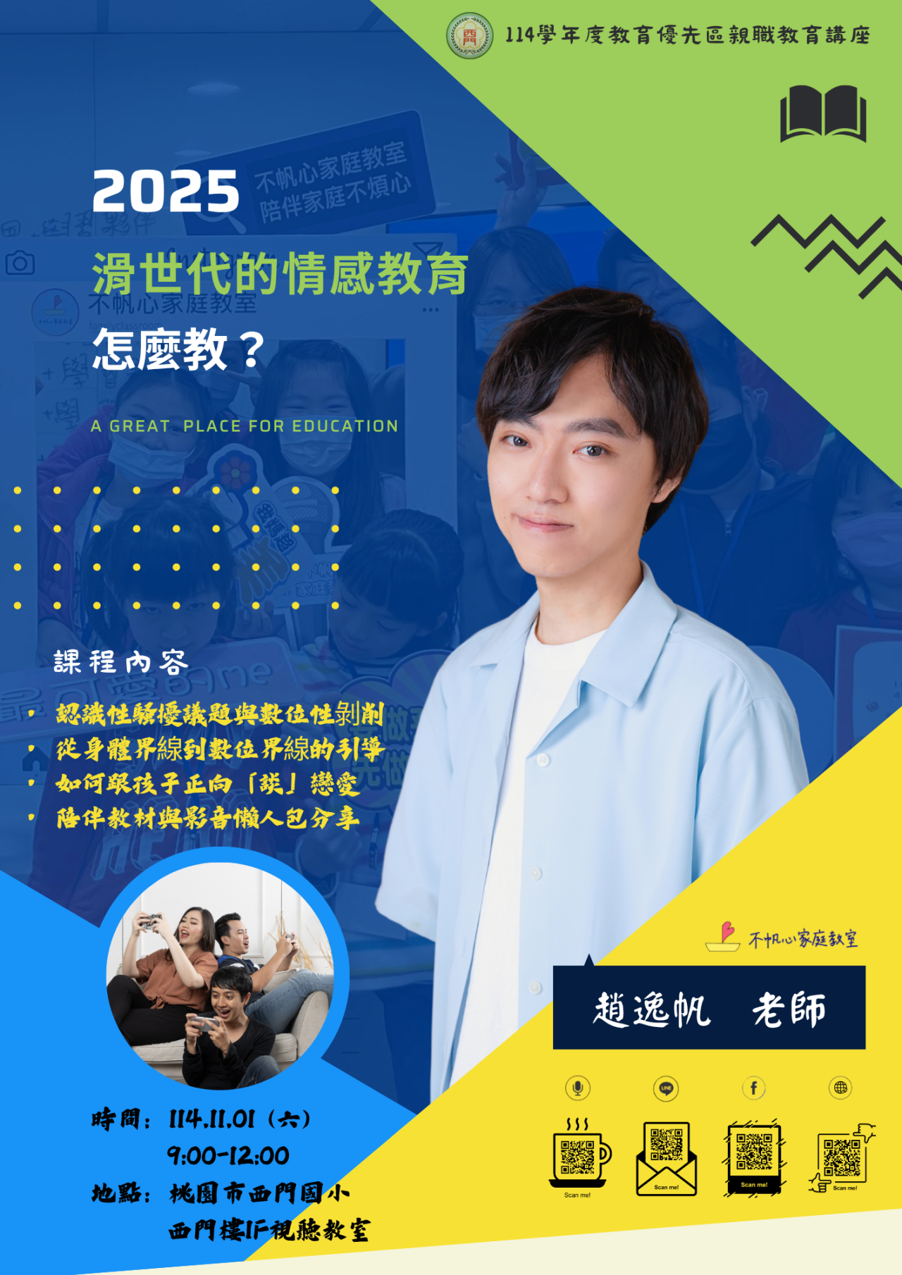 | 三、 | 趙老師畢業於國立臺北教育大學心理與諮商學系,長期關注家庭教育與親職陪伴議題,創立「不帆心家庭教室」,推動「情感教育、媒體教育、探索教育」三大核心方向,協助家長與孩子建立更自由、溫暖的學習關係。除推廣家庭教育外,趙老師亦受邀至多所學校、教育機構及社區團體舉辦講座,主題涵蓋親子溝通、 3C 使用、自我探索與網路安全等議題,並多次受媒體與教育平台專訪。 |
