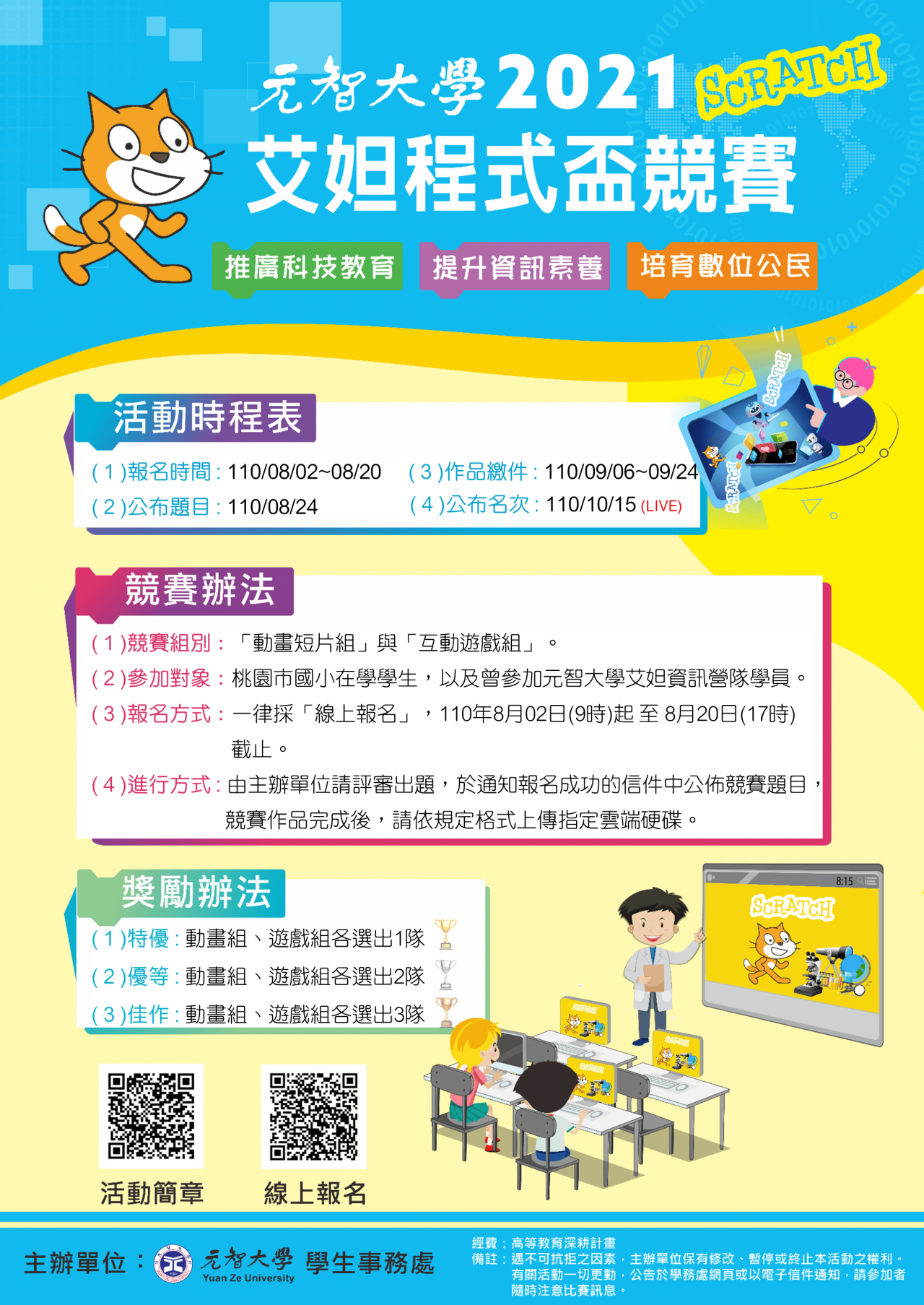 一、    活動宗旨:為提升桃園市各區小學學生之邏輯思考與運算思維等資訊能力,並活絡各校際間資訊活動交流,元智大學舉辦旨揭跨校比賽,透過 SCRATCH 及分享交流機會,激發學生學習成效之動機,實踐課綱規劃之資訊能力核心素養。