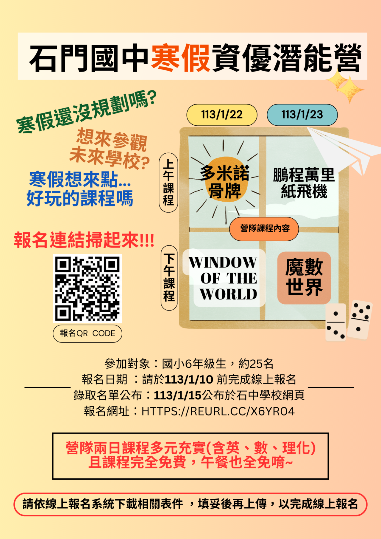 七、錄取公告:於113/1/15石門國中校網最新消息公告營隊錄取名單,並寄送錄取通知至報名系統上所留之email信箱。