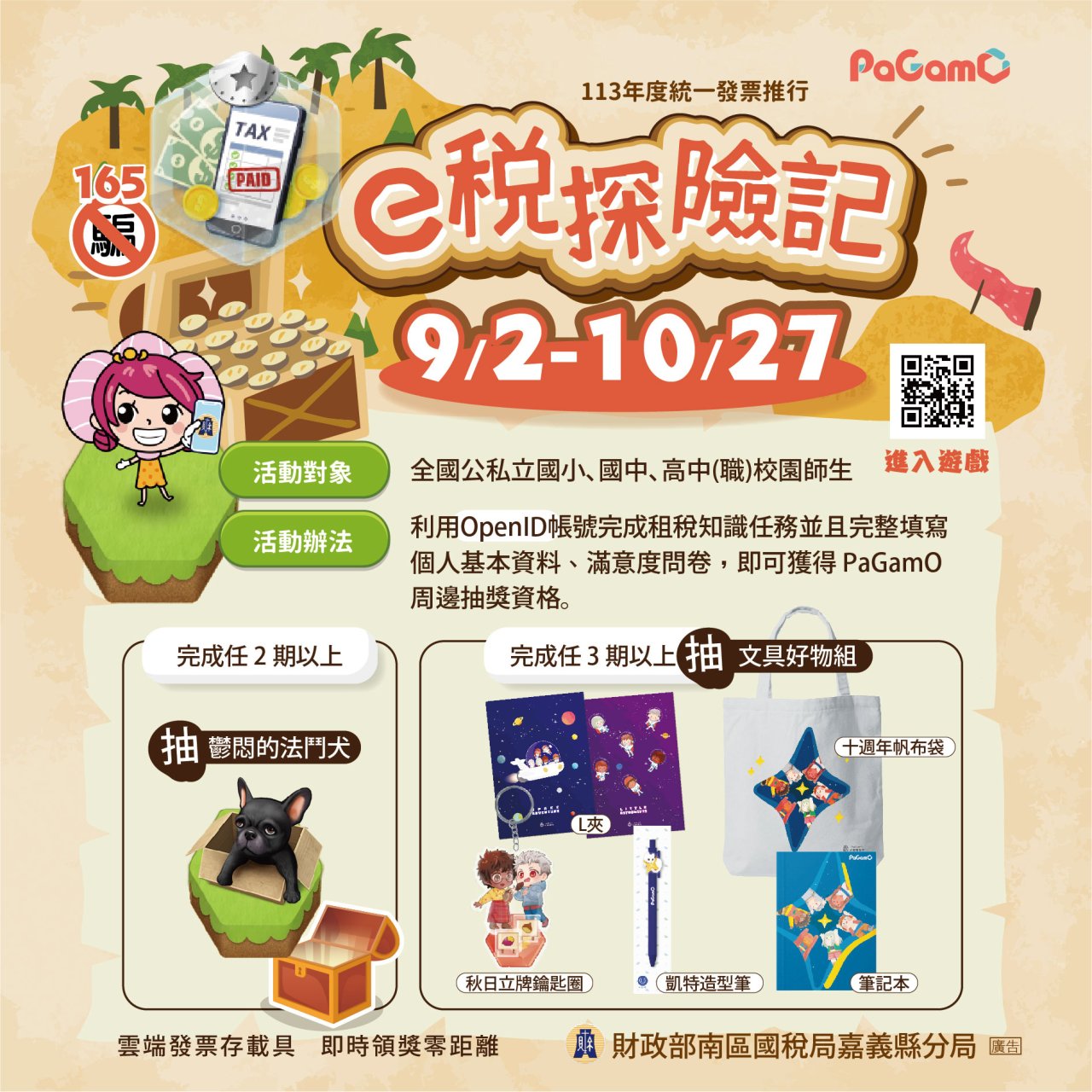 五、 活動辦法:校園師生在活動期間內利用 Open ID 登入 PaGamO 線上遊戲學習平台,完成任一主題任務(有雲端發票、反詐騙、性別平等、廉能政策,總計 4 檔任務)即可領取任務限定「虛擬寶物—E 稅載具」作為任務獎勵。
