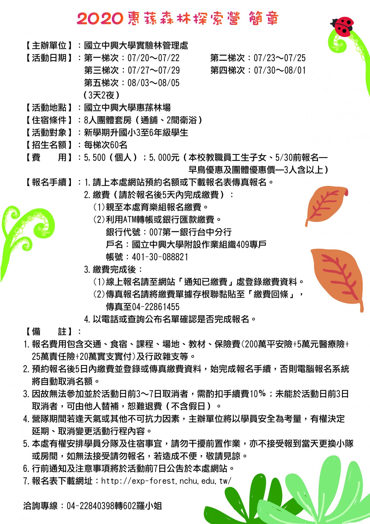 三、活動詳情及相關報名資訊請至該處網站查詢(網址: https://exp-forest.nchu.edu.tw/forest/upload/camp/2020notice.pdf )。