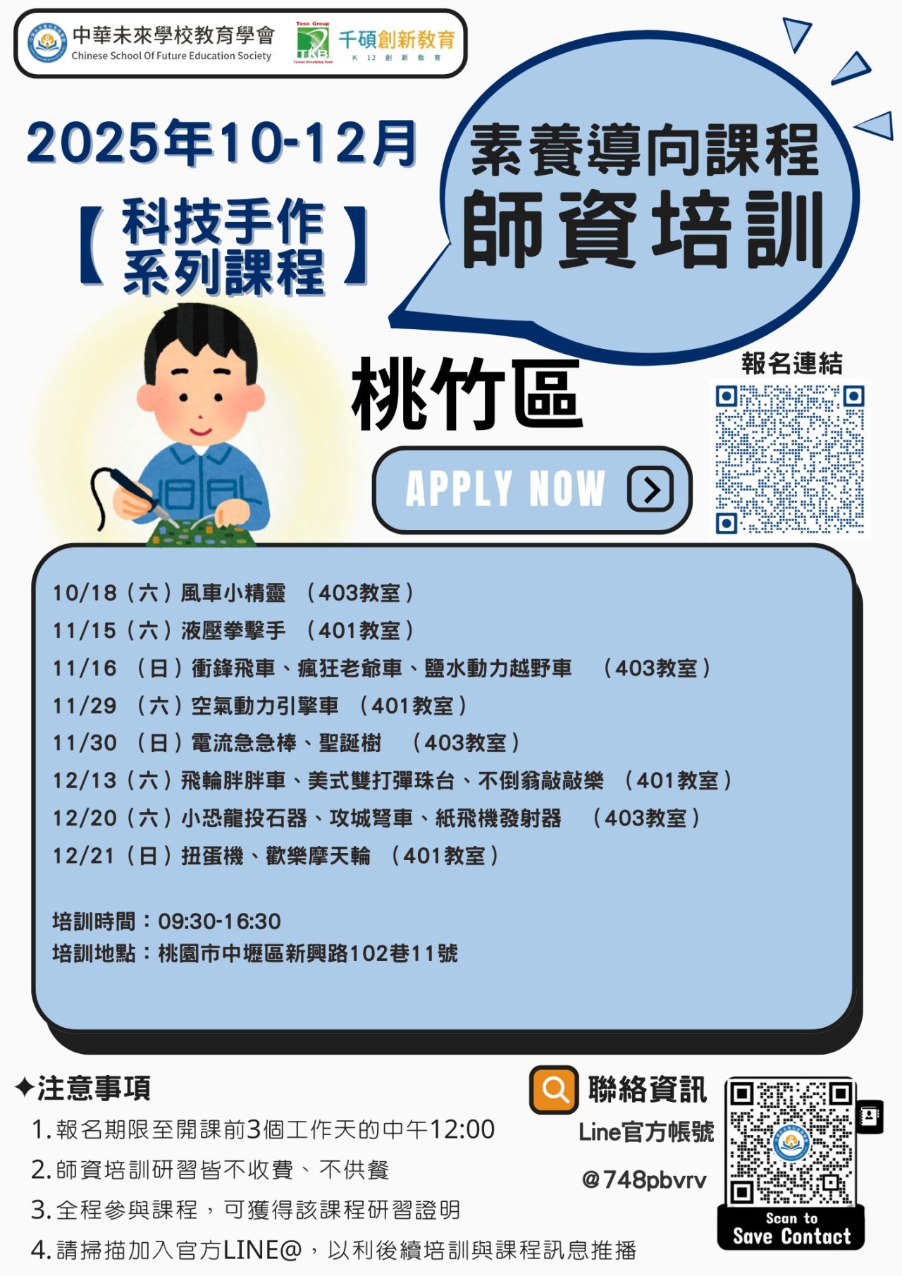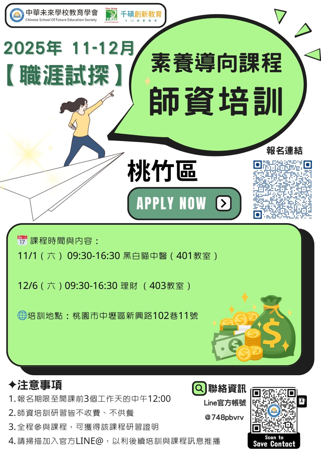 二、本系列研習規劃培訓領域,包含職涯試探領域:中醫、理財,科技素養領域:科技手作,以協助教師精進多元素養教學能力,並拓展教學應用成效,詳見海報資訊。