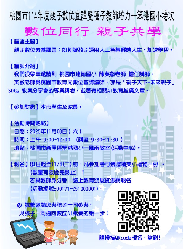 | (五) | 報名方式:請於 114 年 11 月 04 日(星期二)中午 12 時前至 google 表單報名。(報名連結 https://forms.gle/Zyb472Zdi4mdPvVu8),若具教師身分者,請上桃園市教育發展資源入口網報名 (活動編號 E00171-251000001)。 |