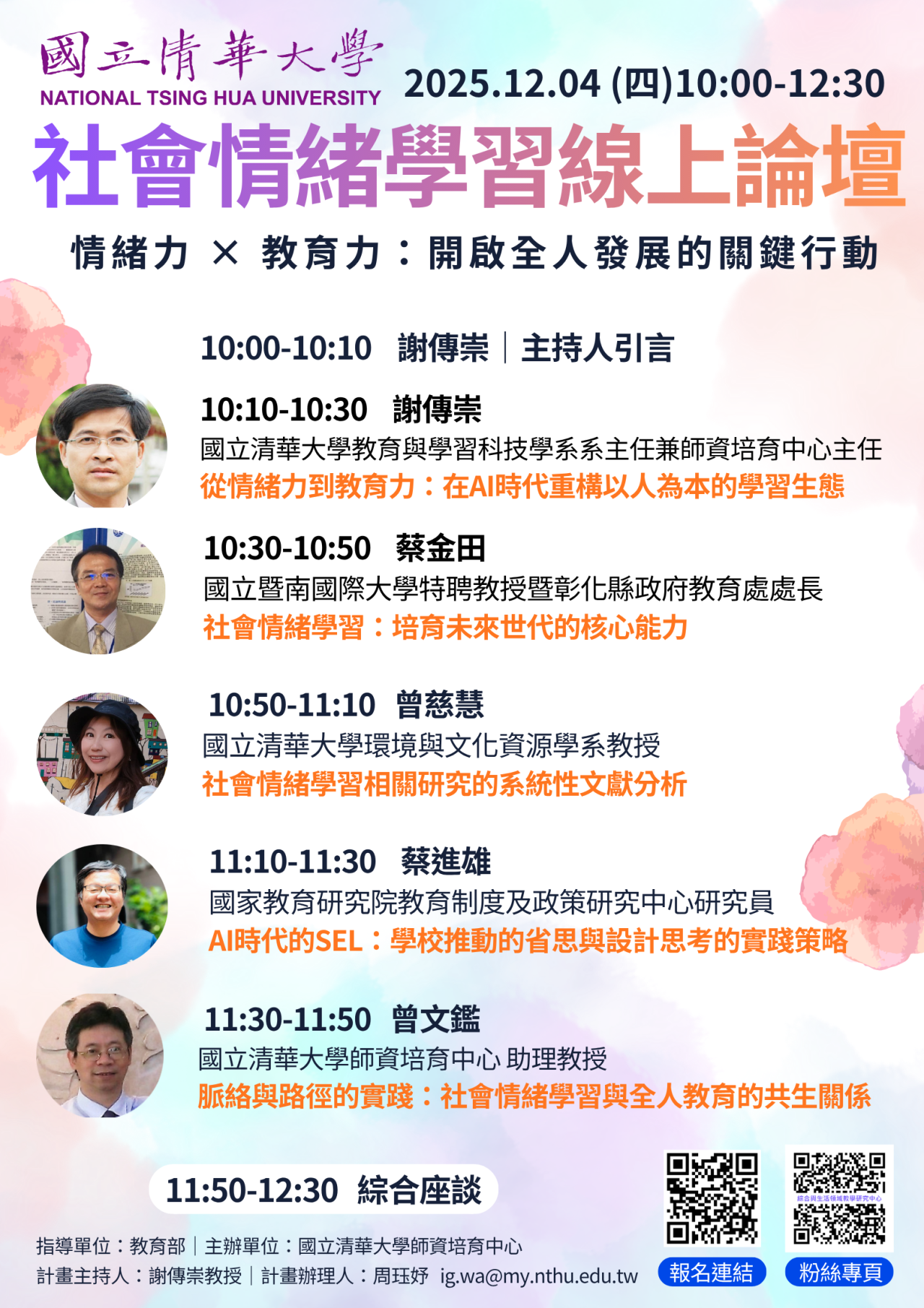 二、 旨揭線上論壇係聚焦「社會情緒學習於教育領域之應用與發展」,探討如何透過提升情緒能力,促進 AI 時代學習者之全人發展;該論壇亦分享相關研究成果及實踐策略,為教育工作者提供具體行動方案與啟發。