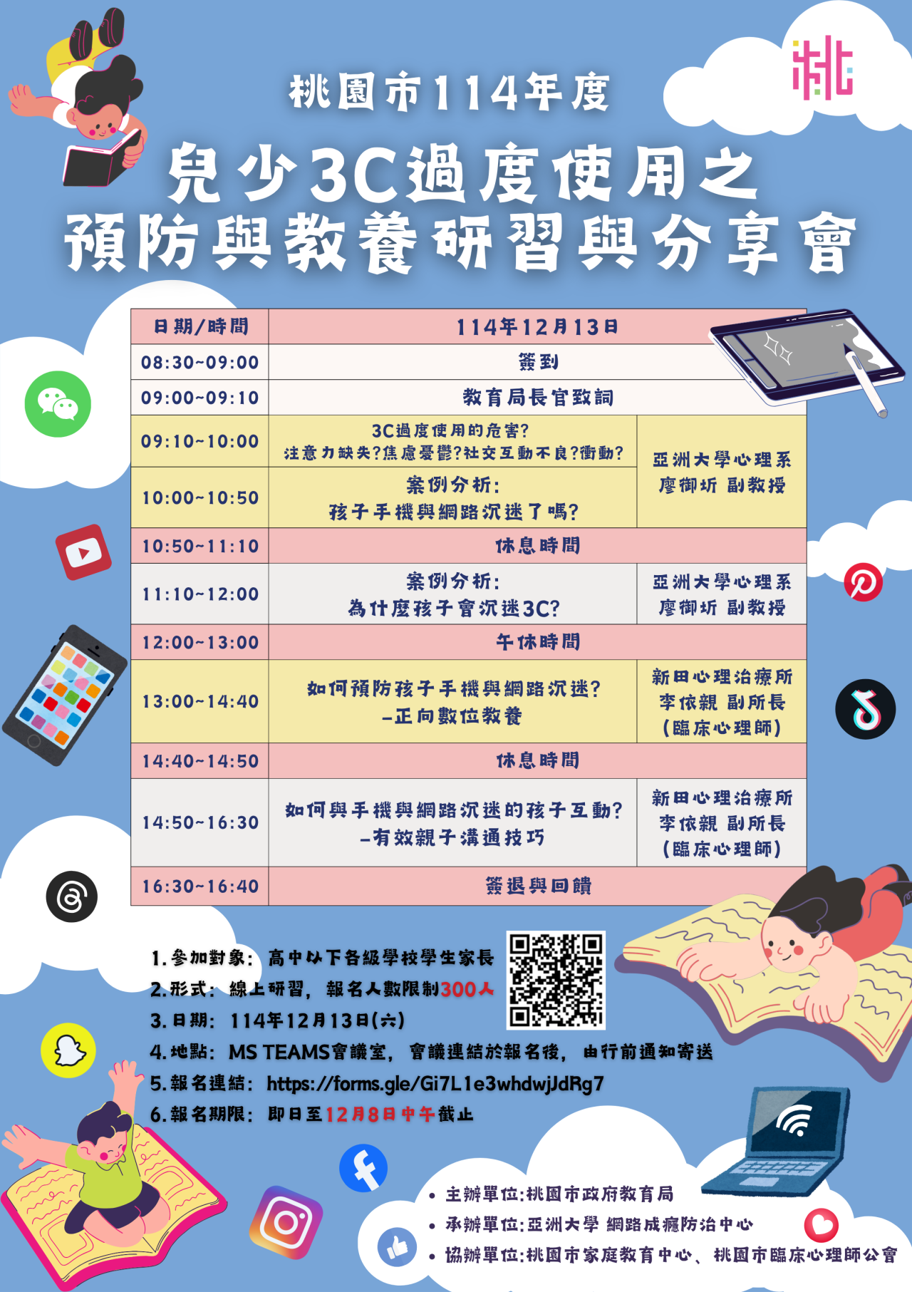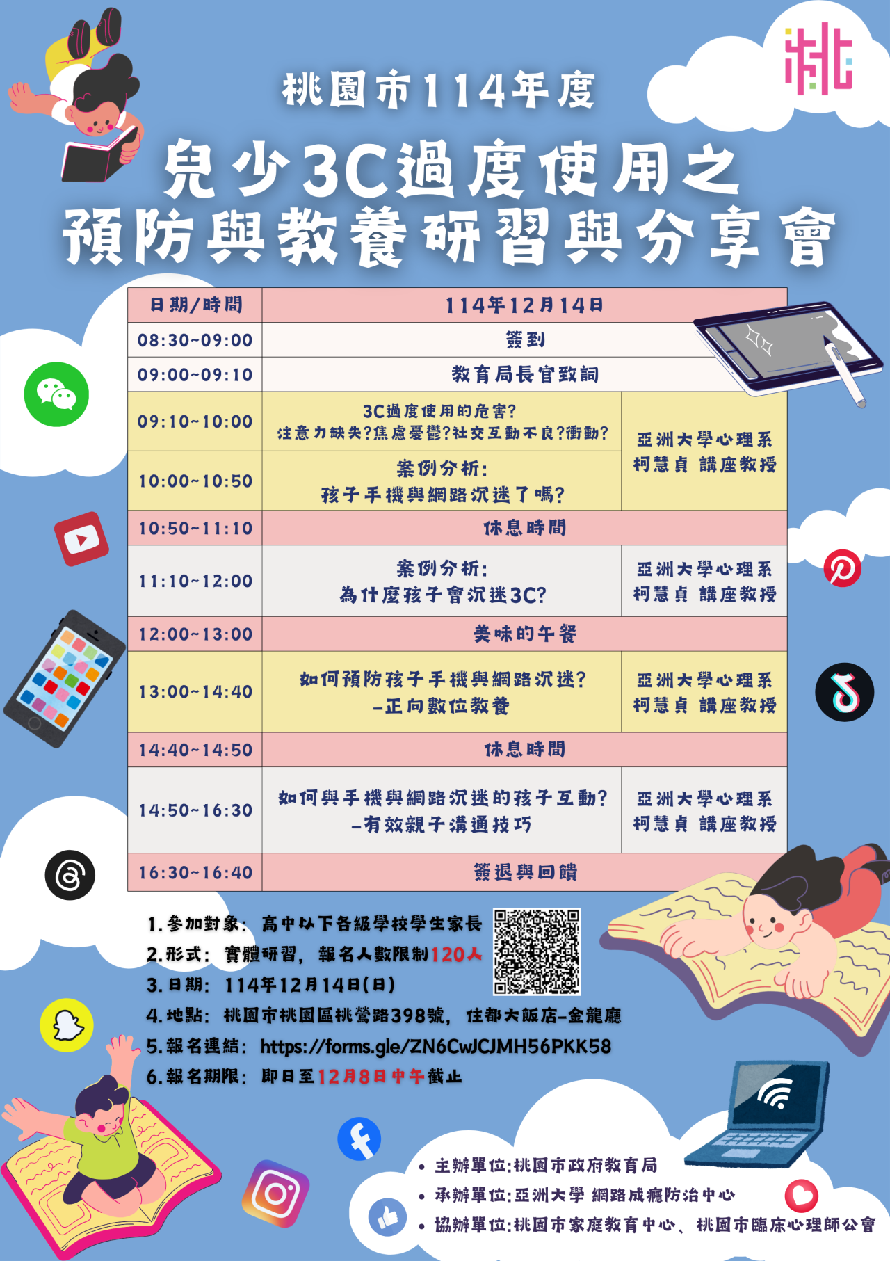 | 二、 | 隨著科技融入生活,過度使用 3C 可能影響孩子的身心發展、專注力、人際互動及作息品質。為協助家長更全面了解 3C 使用對孩子的影響,並掌握有效的家庭教養策略, 114 年度本局與亞洲大學合作辦理旨揭分享會,透過案例分析與互動交流,找到更適合自己孩子的教養方式。 |